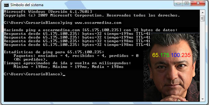 Para saber cuál es el número asignado a una determinada URL y comprobar la conectividad TCP/IP (Transfer Control Protocol / Internet Protocol), Protocolo de Control de comunicación en Internet / Protocolo de Internet, con el comando ping (Packet Internet Groper), búsqueda de direcciones de Internet, basta hacer clic con el mouse yendo a “Inicio” => “Todos los programas” => “Accesorios”, hacer clic abriendo el => “Símbolo del sistema” y, a continuación, hacer ping en el host deseado, utilizando su dirección IP escrita en letras; o sea escribiendo (por ejemplo): ping www.oscarmedina.com …y apretar luego la tecla de envío [Enter], el resultado será su número en la Internet… 65.175.100.135 Esta tecnología ya está aquí: EL SELLO CUÁNTICO |