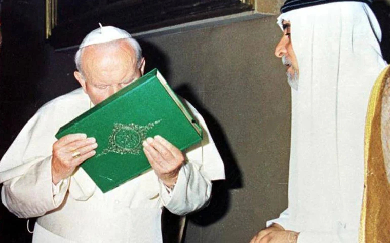 El 12 de diciembre de 1986, Juan Pablo II le reconoce al Gran Muftí de Siria, Ahmed Kaftaro, la autoridad religiosa más importante alguna vez ida a Italia: “¡Todos los días leo un fragmento del Corán!”. La apostasía de Juan Pablo II en Asís |