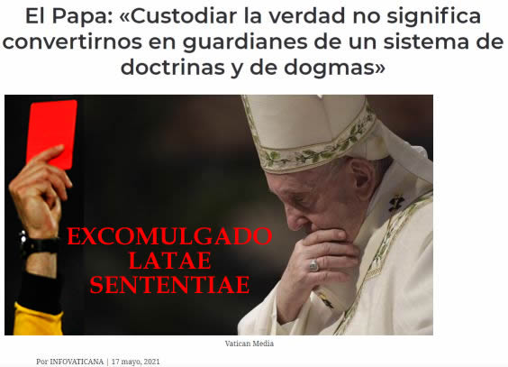 De hecho, desde su elección, debido a sus herejías [incluso anteriores a ella], el Papa Francisco se presenta como excomulgado. Está fuera de la iglesia. Por eso, no puede dirigirla. Y está arrastrando tras él, desafortunadamente, a toda la Iglesia, que permanece inerte y en comunión con él. De esta manera, ha creado, de la noche a la mañana, una contra-iglesia que está engañando a los católicos con la apariencia de catolicidad.