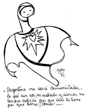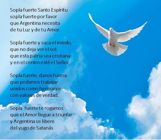 《Sopla fuerte Santo Espíritu, sopla fuerte por favor, que Argentina necesita de tu luz y de tu Amor. Sopla fuerte y saca el miedo, que no deja ver el sol. Que esta patria sea cristiana y en el centro esté el Señor. Sopla fuerte, danos fuerza que podamos trabajar, unidos como hermanos con valores de verdad. Sopla fuerte te rogamos, que el amor llegue a triunfar, y Argentina se libere del yugo de satanás.》 (Oración dada en Salta por la Santísima Madre a la señora Livia el 15/06/2019)