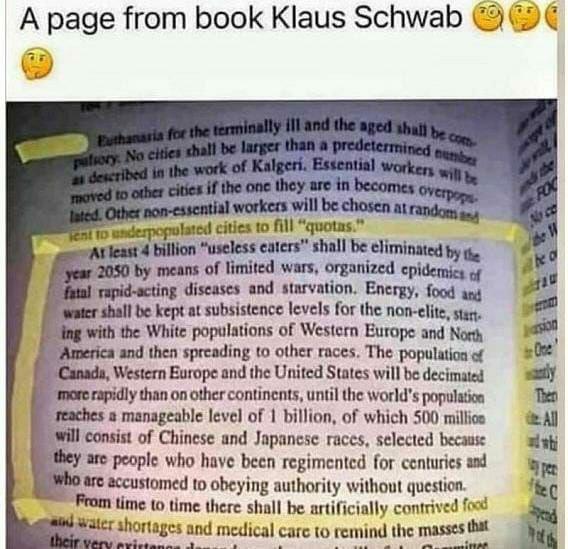 Este extracto no fue escrito por Klaus Martin Schwab. Fue tomado de un libro titulado "Jerarquía de conspiradores: la historia del Comité de los 300" (‘Conspirators’ Hierarchy: The Story of the Committee of 300) y escrito por el Dr. John Coleman (un autor británico y ex agente secreto del MI6): Al menos 4000 millones de "comedores inútiles" serán eliminados para el año 2050 mediante guerras limitadas, epidemias organizadas de enfermedades mortales de acción rápida y hambruna. La energía, los alimentos y el agua se mantendrán a un nivel de subsistencia para los que no pertenecen a la élite, con las poblaciones blancas de Europa occidental y América del Norte y la propagación a otras razas. Las poblaciones de Canadá, Europa occidental y Estados Unidos serán diezmadas más rápidamente que otros continentes, hasta que la población mundial alcance un nivel manejable de mil millones, de los cuales 500 millones estarán formados por las razas chinas y japonesas, seleccionadas porque son personas que han sido regimentadas durante siglos y que están acostumbradas a obedecer a la autoridad sin cuestionar.